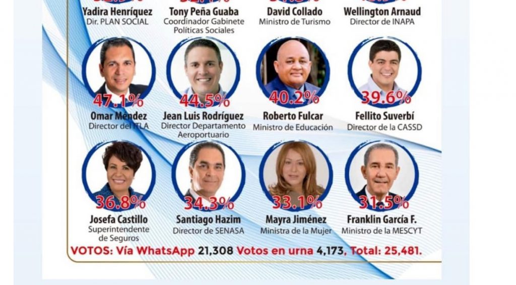 No solo la gestión del presidente Abinader ha sido visualizada por la sociedad, sino que esta vez, a través de una encuesta a boca de urna y vía Whatsapp, ha señalado los ministros y directores de diferentes entidades gubernamentales que han sido considerado como los mas sobresalientes del Estado Dominicano.