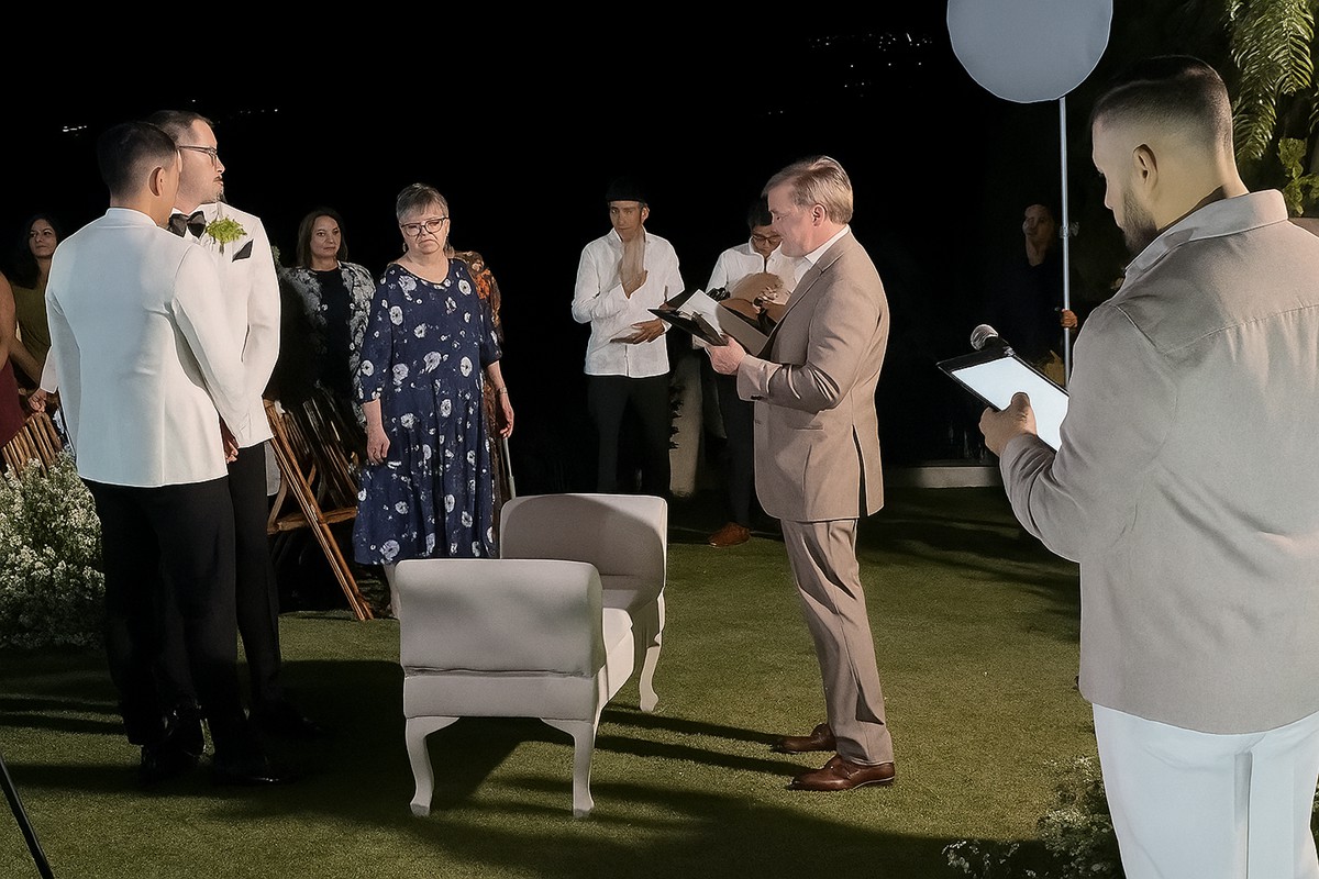 Según versiones difundidas en redes sociales durante el pasado fin de semana, el exdiplomático habría participado en una ceremonia simbólica en Santiago de los Caballeros, donde —de acuerdo con las publicaciones— dos hombres contrajeron matrimonio en un evento privado con la presencia de allegados y figuras vinculadas a grupos defensores de derechos LGBT+. Hasta el momento, no existen registros oficiales del acto ante ninguna instancia del Estado ni confirmación de que se tratara de un matrimonio civil legalmente reconocido.