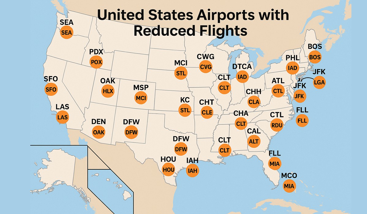 Aunque la FAA no dio la lista completa de inmediato, los informes señalan que los centros de mayor tráfico —como los de Hartsfield‑Jackson Atlanta International Airport (Atlanta), Los Angeles International Airport (L.A.), Chicago O’Hare International Airport (Chicago, O’Hare), y los tres aeropuertos del área metropolitana de Nueva York— figuran entre los afectados.