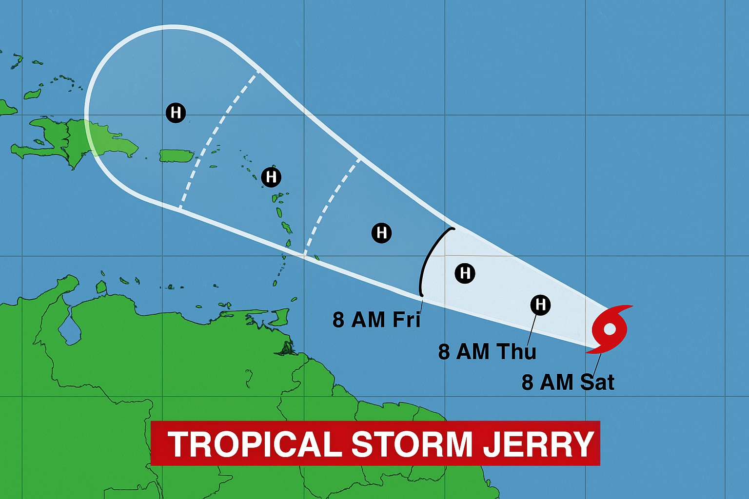 RD Herald / Reporte meteorológico. — Una nueva perturbación tropical en el Atlántico lleva el nombre de tormenta Jerry, y los pronósticos indican que podría intensificarse en las próximas horas.